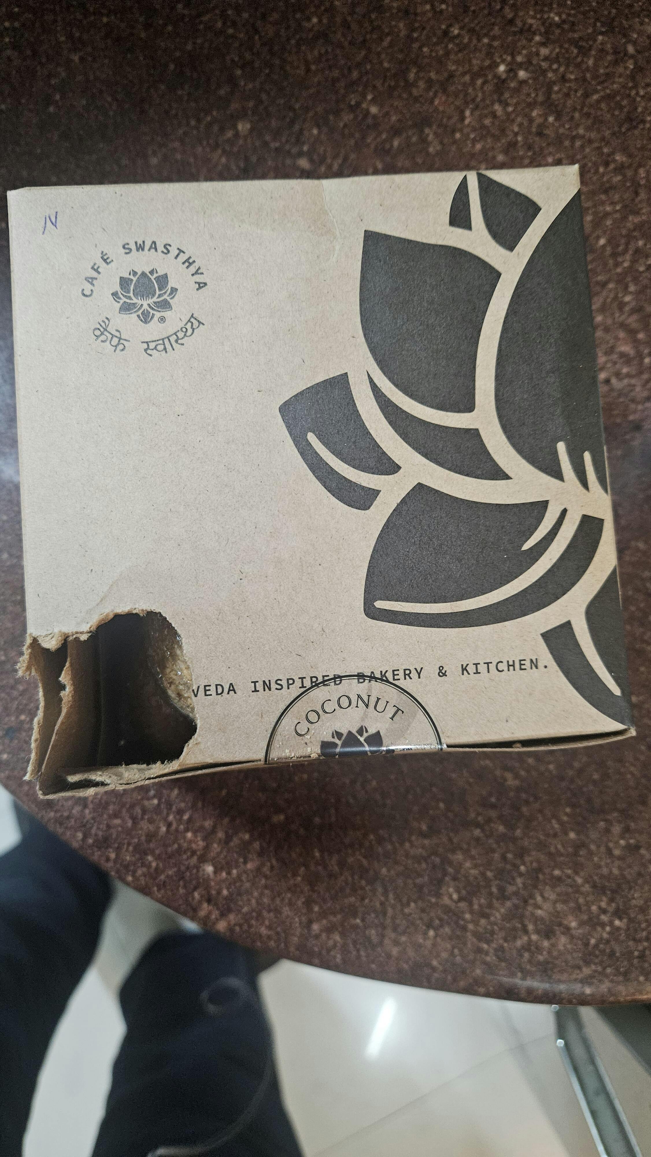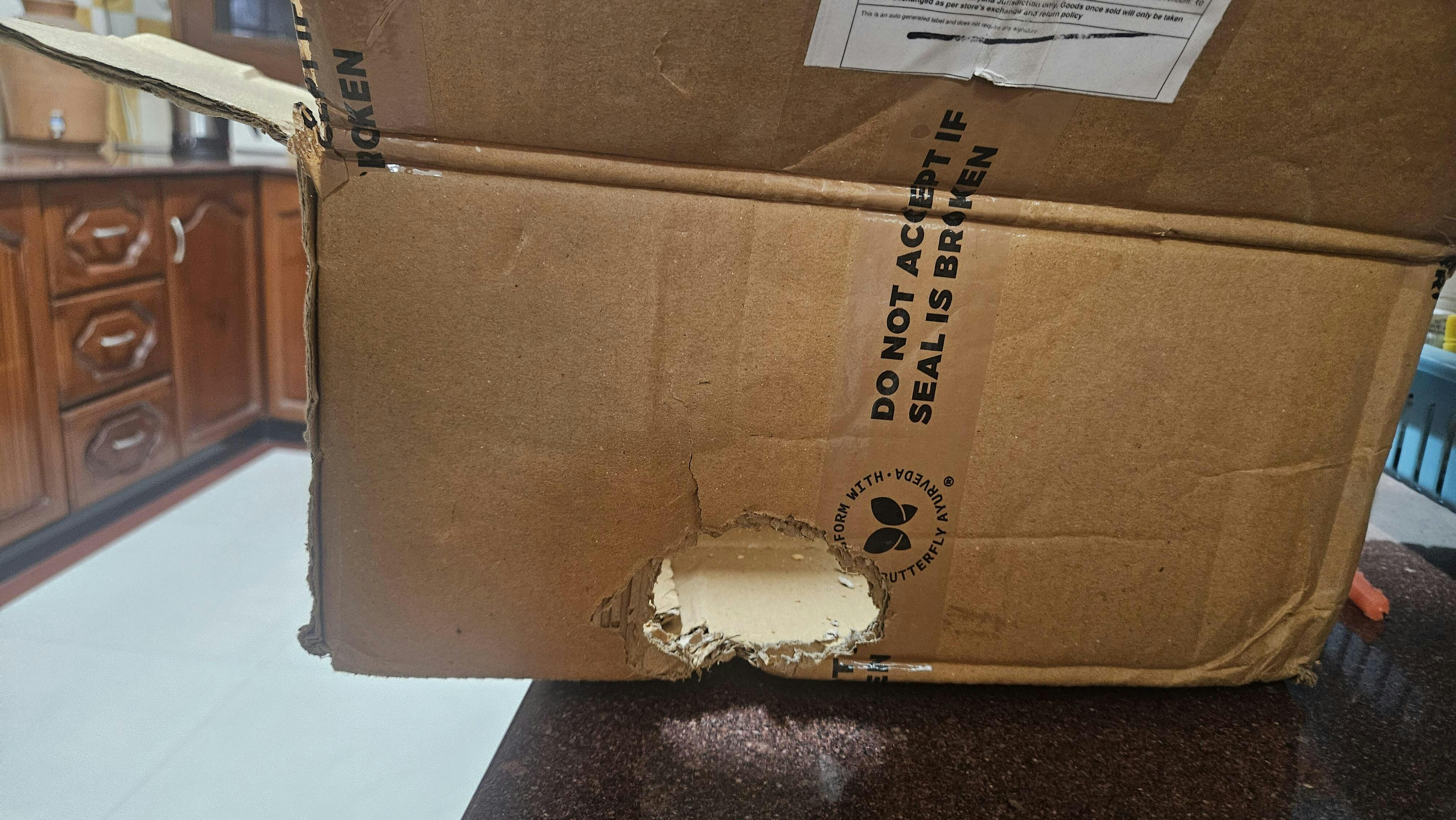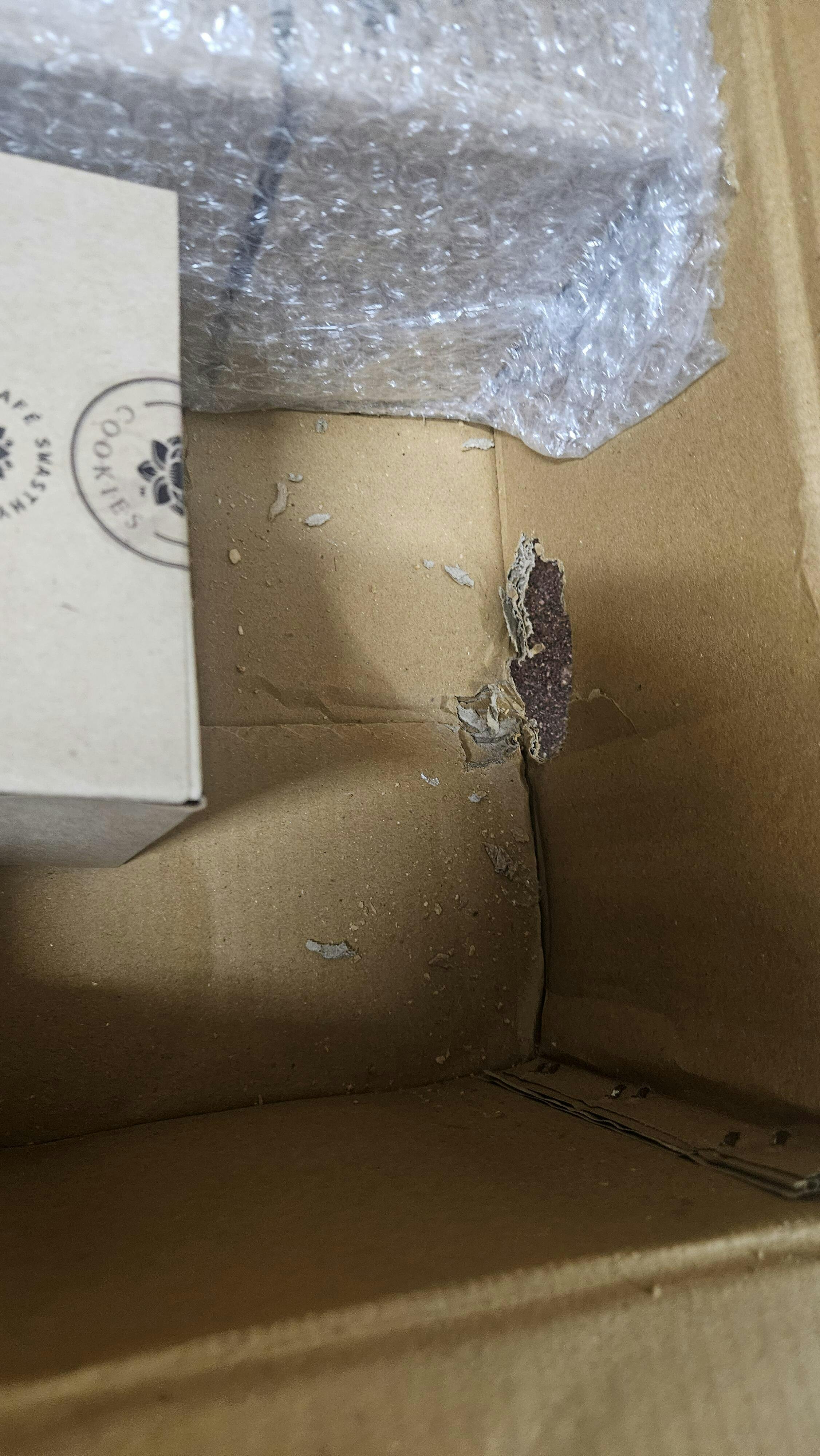 Upon inspection, the outer carton has a hole in it, and the internal small carton of coconut cookies is also damaged. It appears that rodents have compromised the packaging; one packet of cookies was opened and the contents were consumed. I have attached photos of the damaged parcel to this email for your reference.