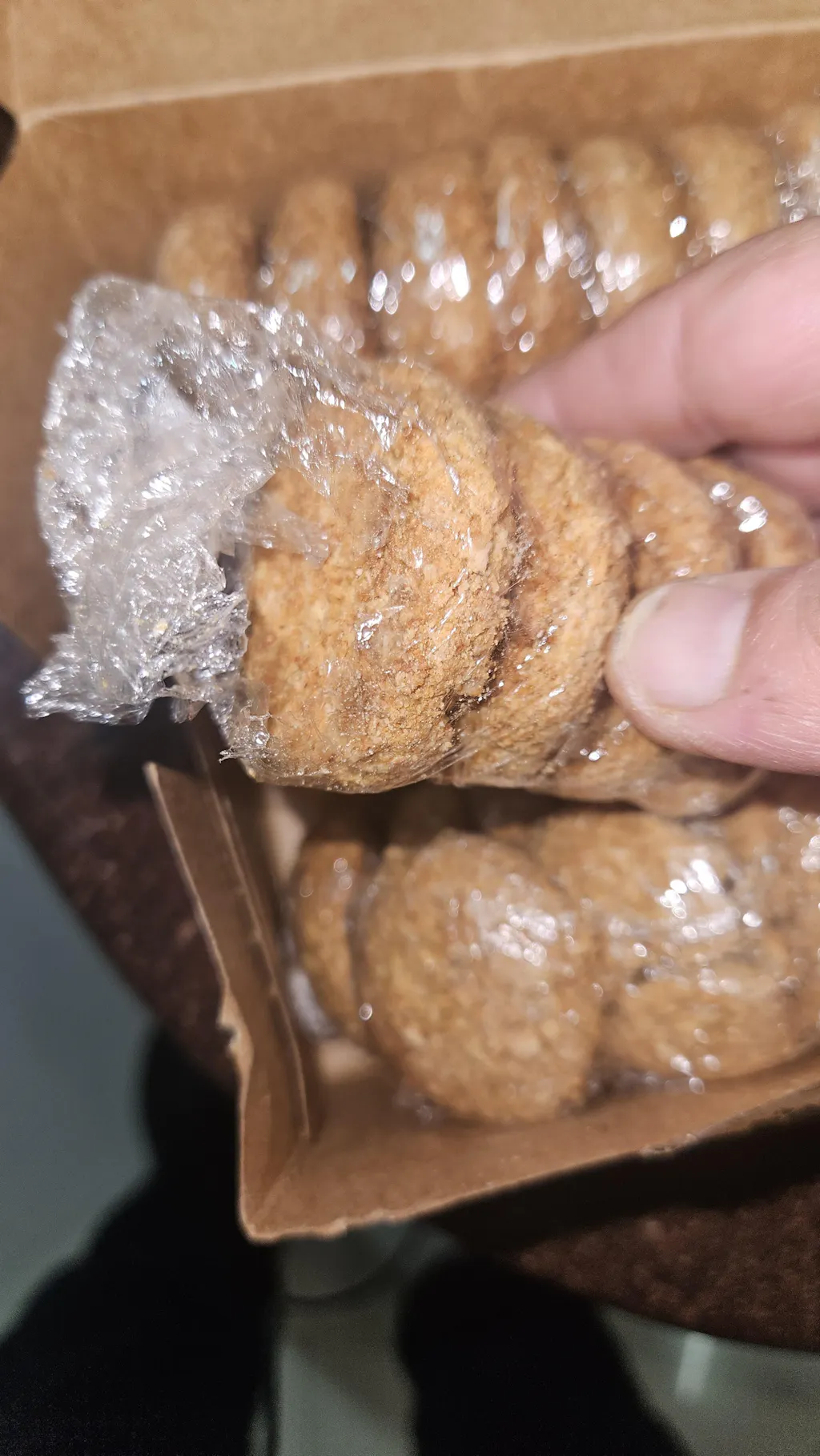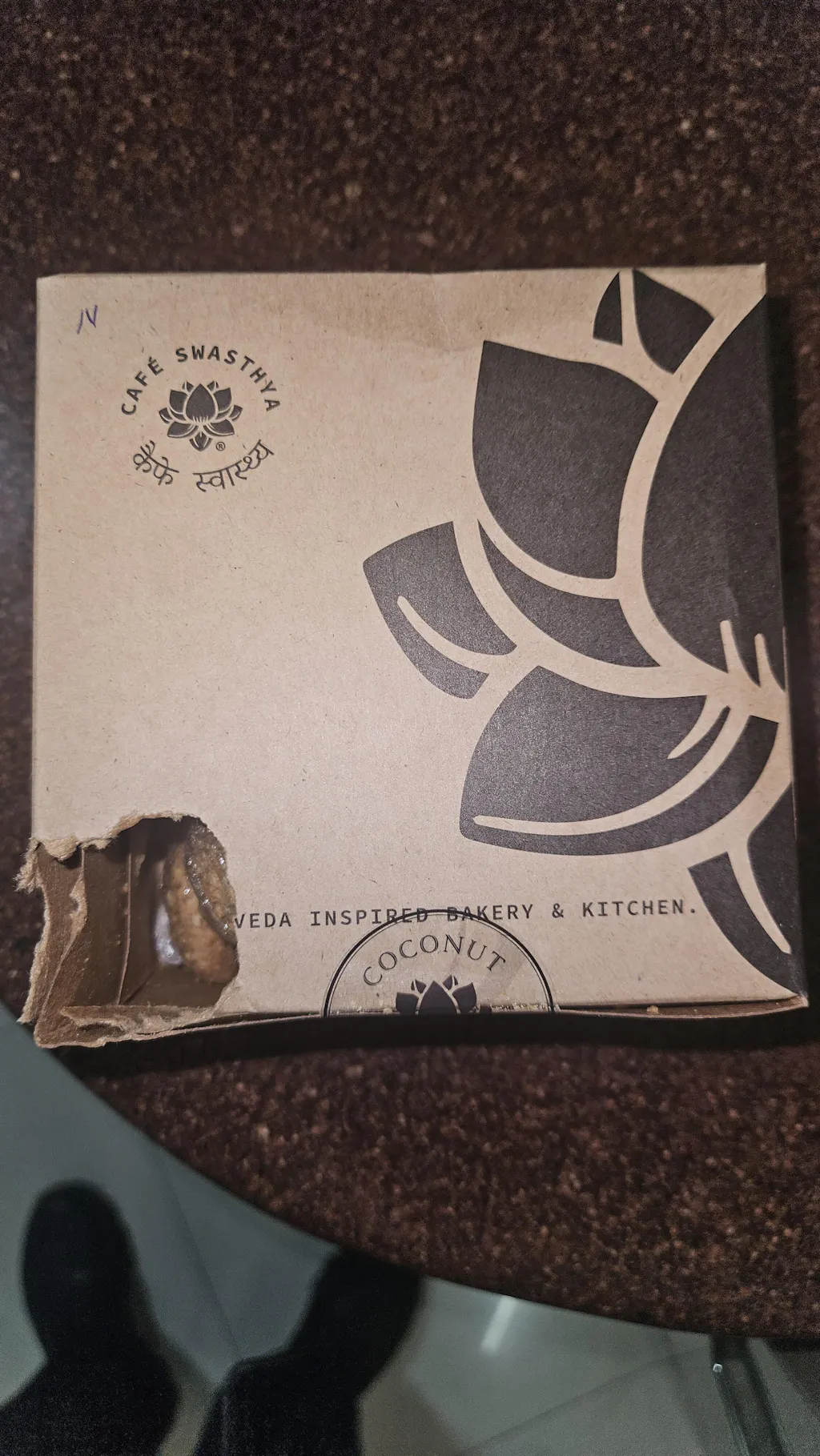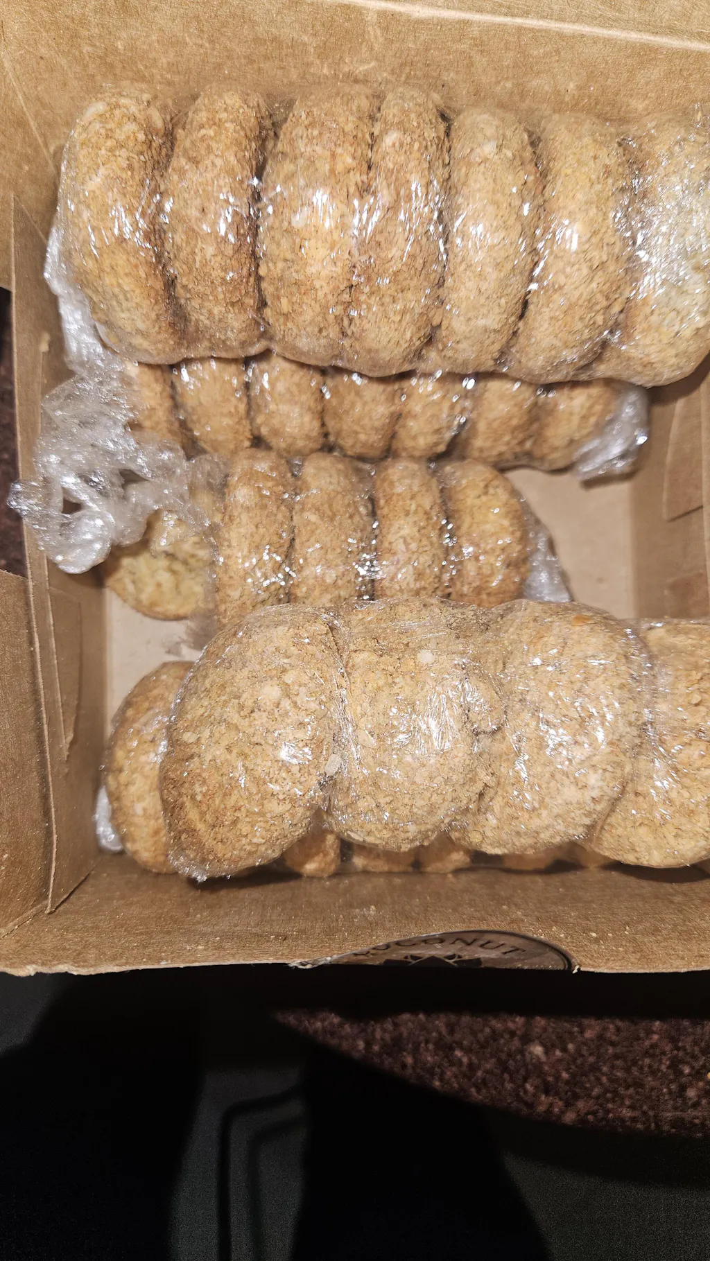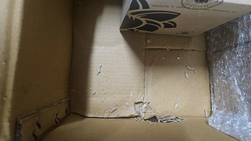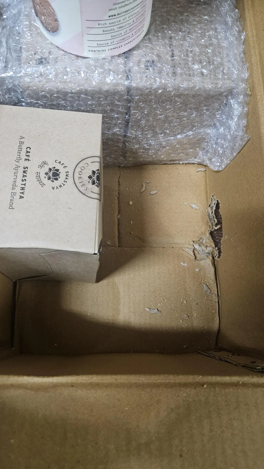 Upon inspection, the outer carton has a hole in it, and the internal small carton of coconut cookies is also damaged. It appears that rodents have compromised the packaging; one packet of cookies was opened and the contents were consumed. I have attached photos of the damaged parcel to this email for your reference.